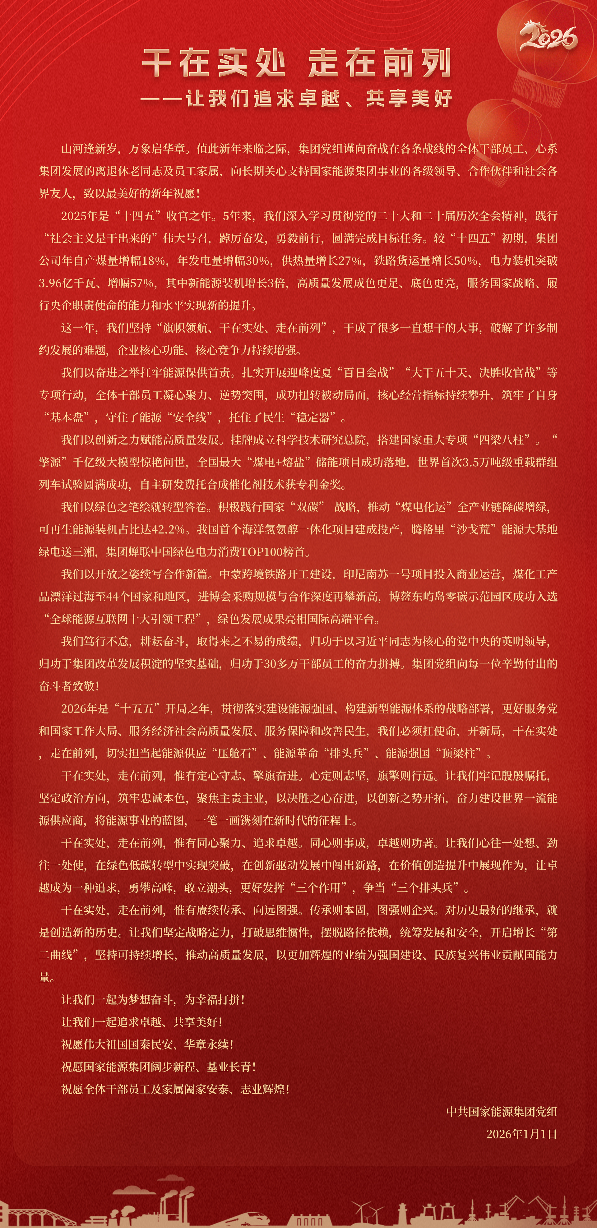 國家能源集團胸懷“國之大者”,增產增供、穩(wěn)價穩(wěn)市,積極服從服務國家戰(zhàn)略、保障國家能源安全、助力國民經濟穩(wěn)增長,推動煤炭安全綠色智能、煤電清潔高效穩(wěn)定、現代煤化工高端多元低碳、運輸物流協同一體、新能源多元創(chuàng)新規(guī)?;l(fā)展,全力擔當能源強國頂梁柱,能源供應壓艙石,能源革命排頭兵。